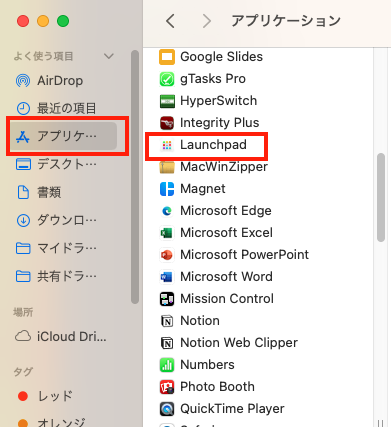 画面下のDock(ドック)にある銀色のロケットアイコンがあればそれを起動しましょう。もしなければ「Launchpad」を開きます。「Launchpad」は、アプリケーションの中にあるため、見つからない人は、まずフォルダを開けて、左側にでる「よく使う項目」から「アプリケーション」を探しましょう。